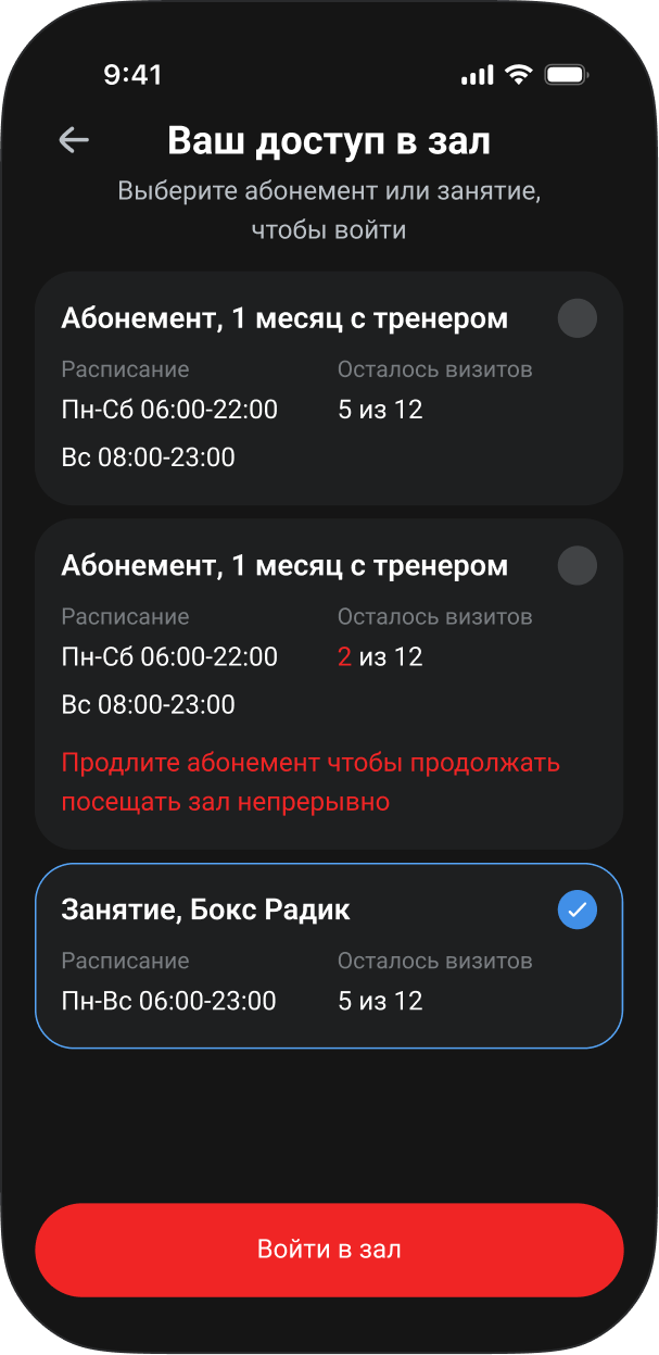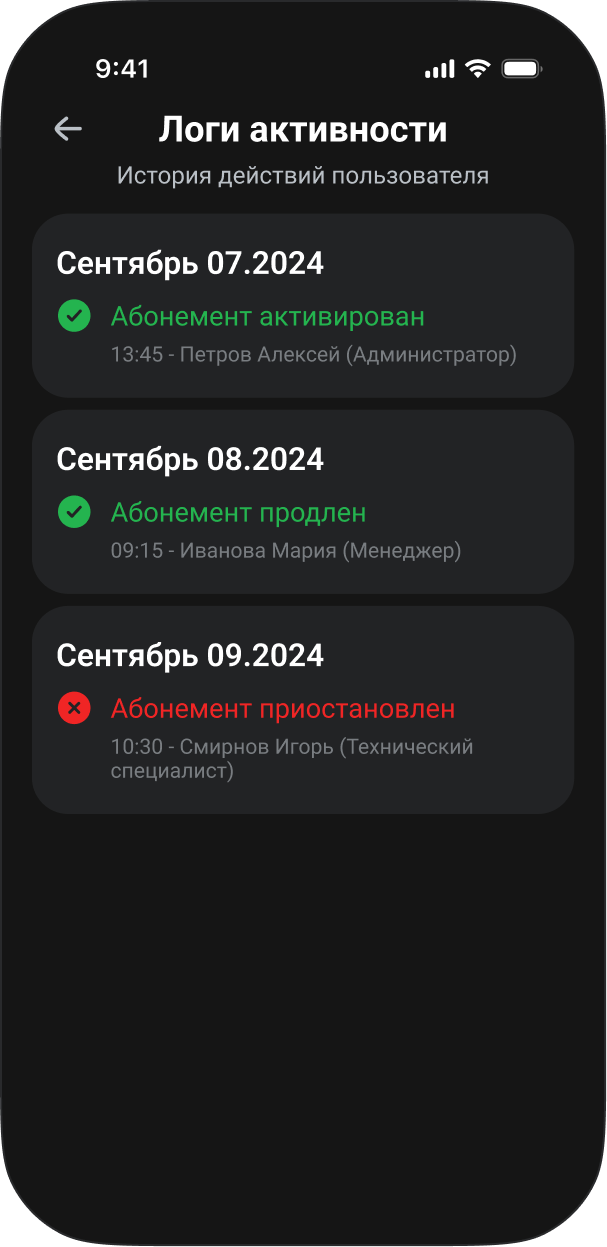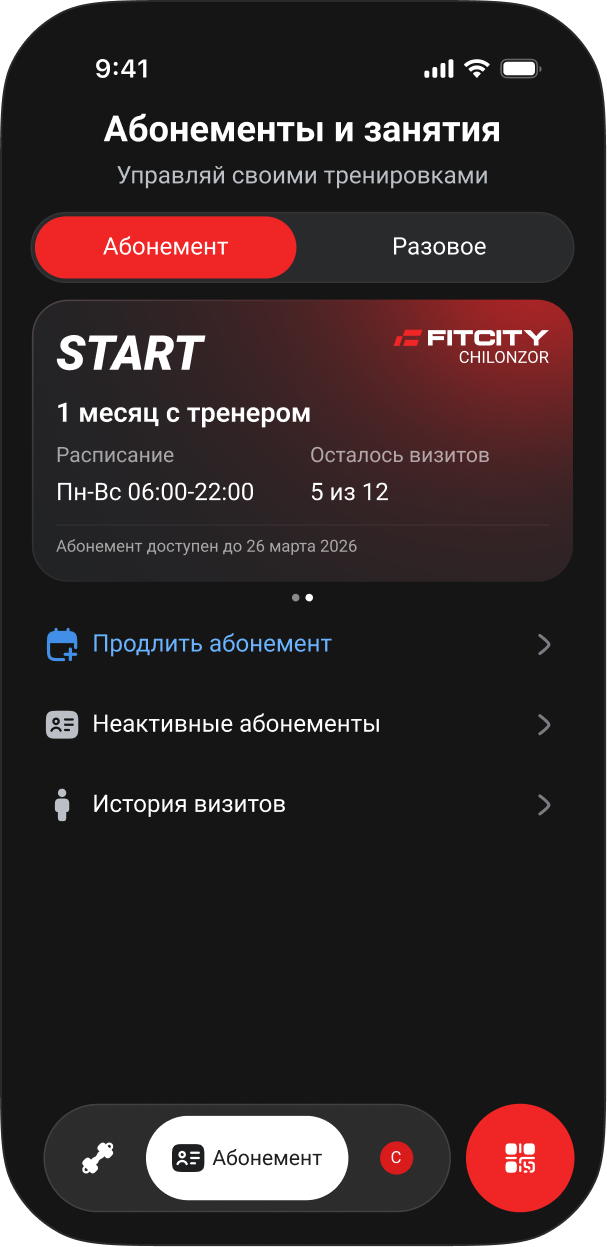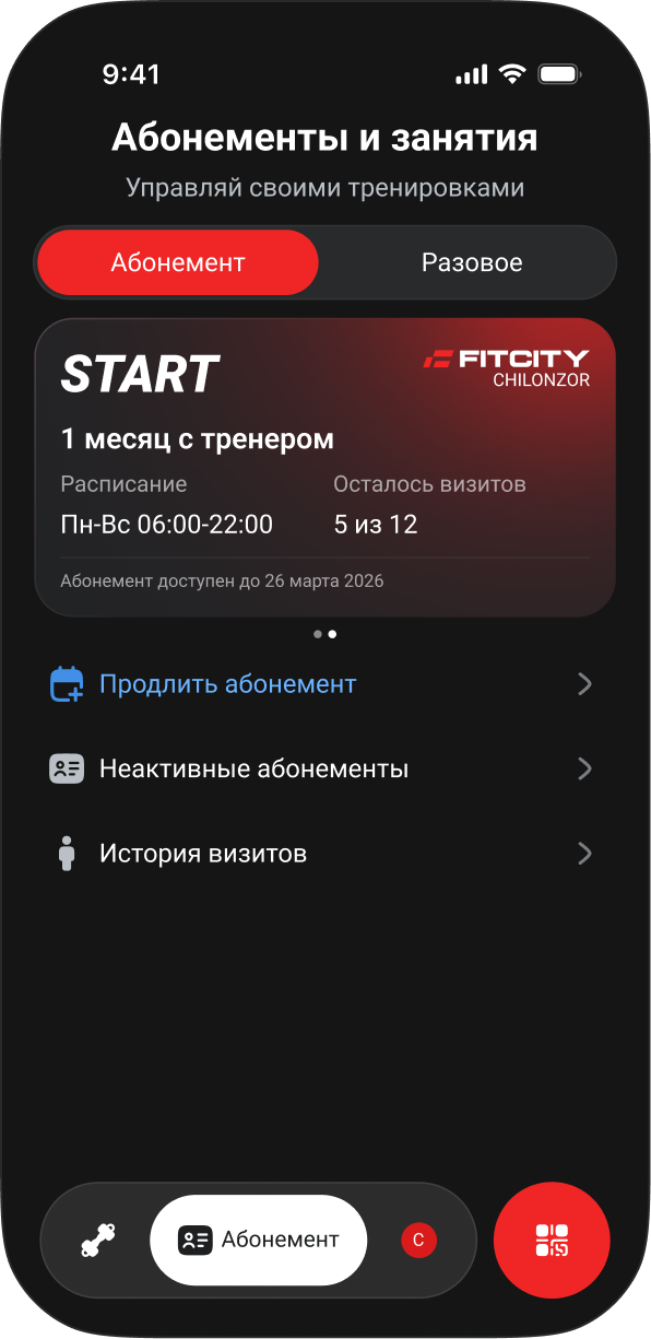 Продлевайте действующий абонемент, смотрите историю визитов и храните неактивные — всё прозрачно и доступно